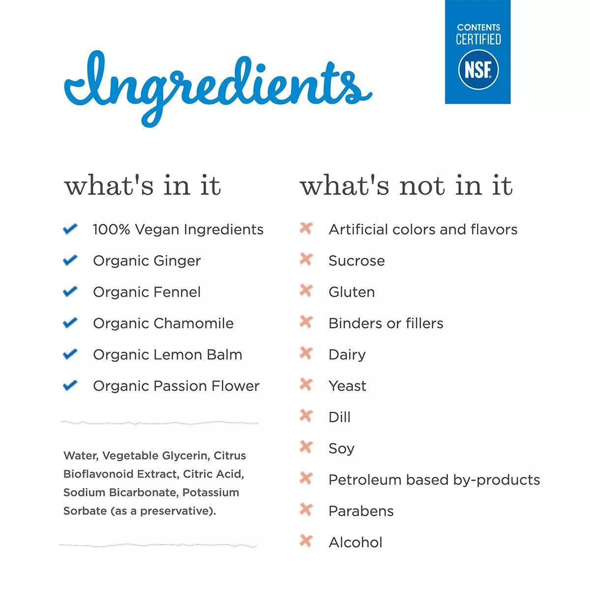 Purified Water, Vegetable Glycerin, Citrus Bioflavonoid Extract, Citric Acid, Sodium Bicarbonate, Potassium Sorbate (as a preservative), Organic Ginger Root (Zingiber officinale) Organic Fennel Seed (Foeniculum vulgare), Natural Fennel Flavor