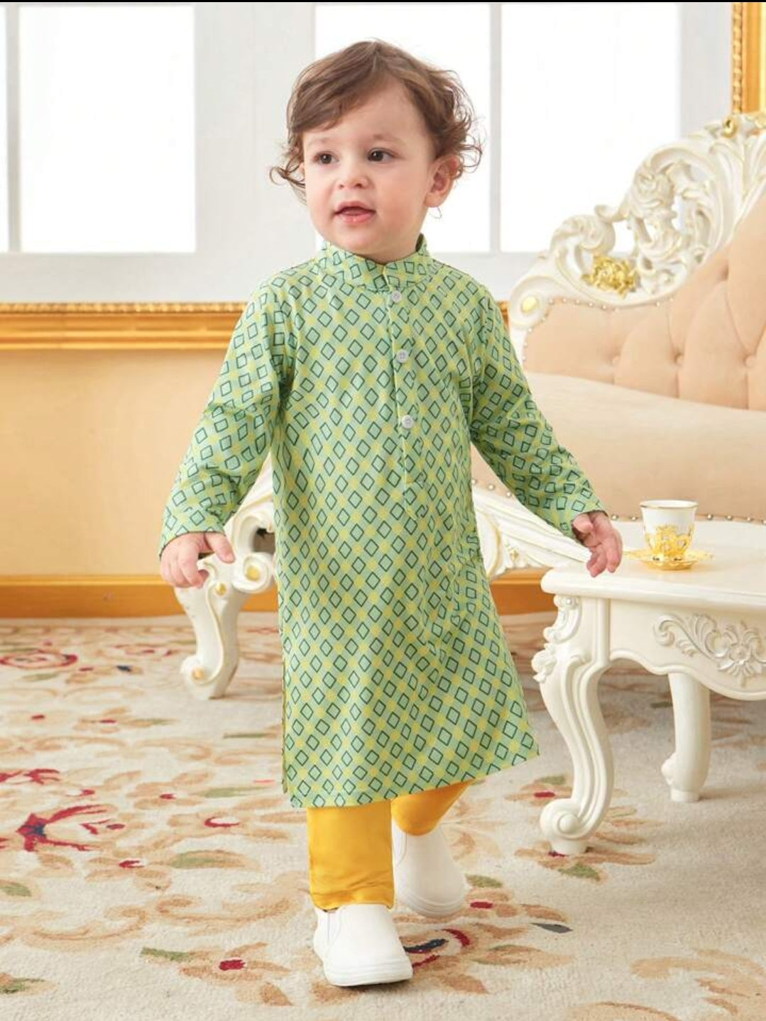 Baby Boy Geometric Printed Panjabi Style Dress- Green SHBPG06